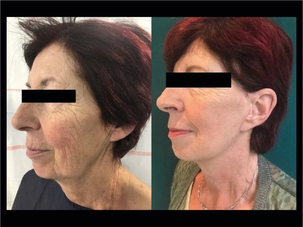 Patiente âgée de 64 ans souhaitant effacer ses bajoues et retendre son cou. Lifting cervico-facial réalisé en 2 heures, sous anesthésie générale avec 24 heures d’hospitalisation.Aspect très naturel, pas d’aspect figé du visage, de face comme de...