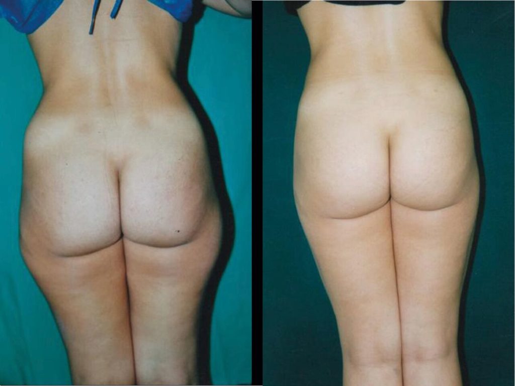 Jeune femme de 28 ans opérée par le chirurgien Dr Alain Ankri, sous anesthésie locale, pour traitement par lipo aspiration de la culotte de cheval. Lipo aspiration totale de 900 cc. Résultat à 1 an.